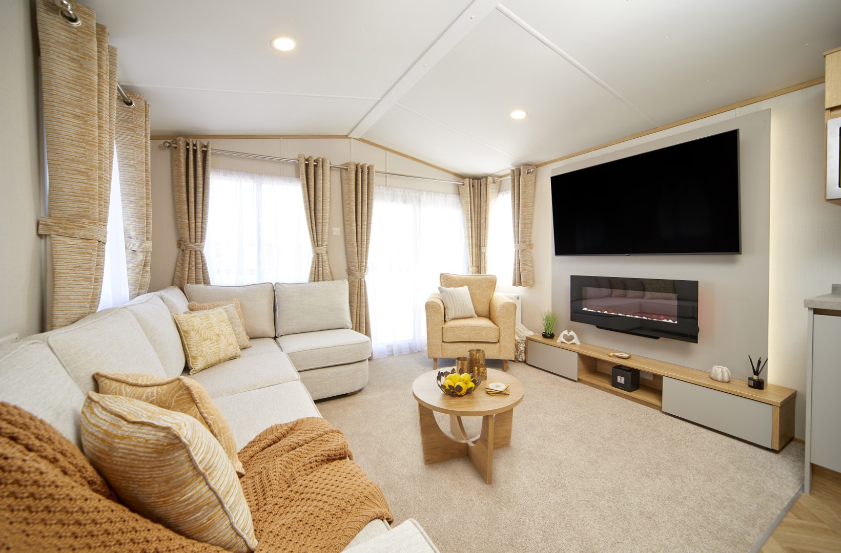 With soft neutral tones, golden oak accents, and warm greys, the Melrose is all about effortless style with a splash of fun. Pops of colour in the soft furnishings add a playful touch, while a cosy corner sofa and standalone armchair invite you to kick back and relax. The bespoke media wall, designed to hold a 65" TV, sets the scene for family movie nights.